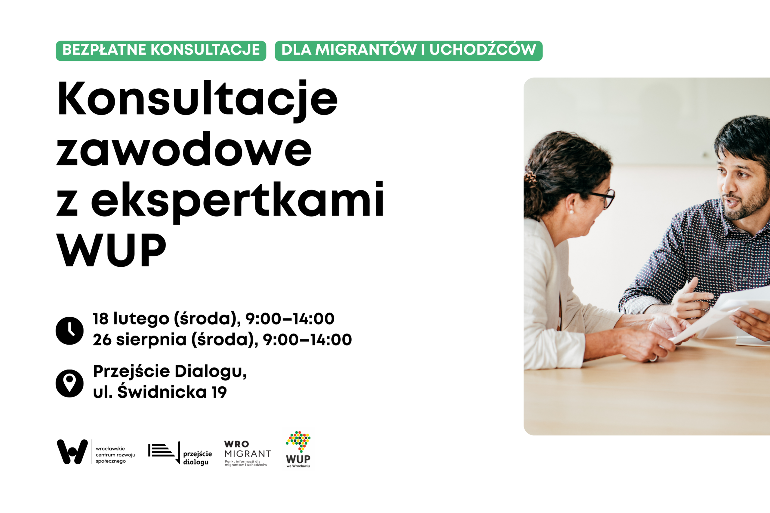 WroMigrant we współpracy z Wojewódzkim Urzędem Pracy we Wrocławiu organizuje konsultacje zawodowe dla migrantów i uchodźców. Konsultacje są bezpłatne i prowadzone w języku polskim, z zapewnionym wsparciem tłumaczeniowym na język ukraiński lub rosyjski.