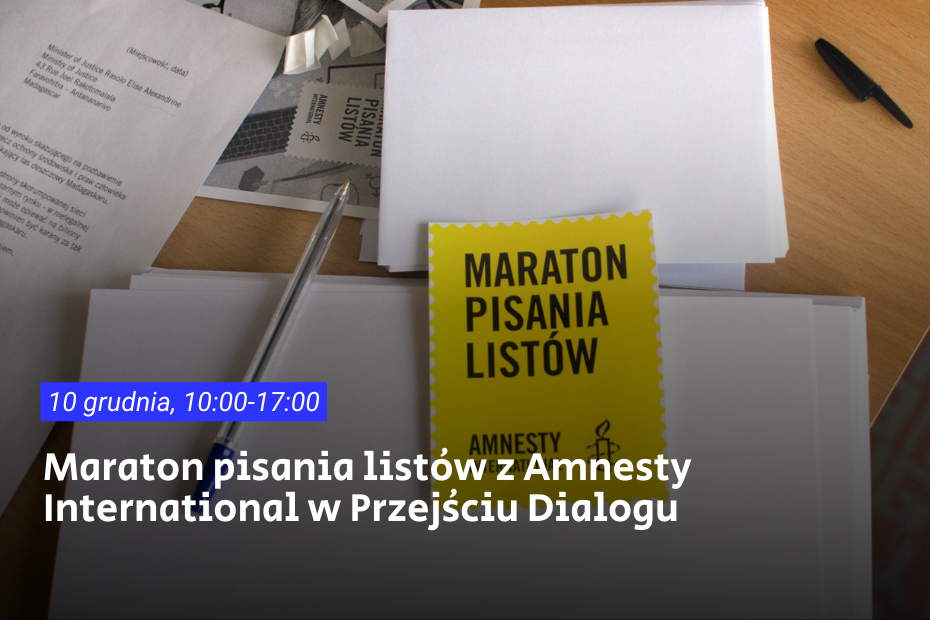 Maraton Pisania Listów to największa na świecie akcja na rzecz praw człowieka. Co roku, w okolicach Międzynarodowego Dnia Praw Człowieka, miliony osób na całym globie siadają do pisania listów, by upomnieć się o tych, których prawa zostały złamane. To właśnie te listy – kierowane do osób decyzyjnych i bezpośrednio do bohaterów oraz bohaterek danej sprawy – realnie odmieniają ludzkie losy. Pokazują, że nie są sami i że presja międzynarodowej… Czytaj dalej »Napisz list – zmień życie! Maraton pisania listów z Amnesty International w Przejściu Dialogu
