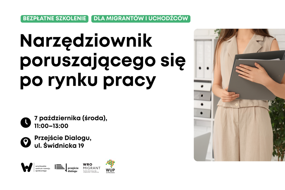 WroMigrant wspólnie z Wojewódzkim Urzędem Pracy we Wrocławiu zapraszają do udziału w praktycznym szkoleniu, które pomoże Ci lepiej odnaleźć się na rynku pracy. Podczas szkolenia: Poznasz specyfikę lokalnego rynku pracy i zapotrzebowanie na konkretne zawody. Dowiesz się, jakie są oczekiwania pracodawców wobec kandydatów. Nauczysz się skutecznych metod aktywnego poszukiwania pracy. Zdobędziesz wiedzę na temat niezbędnej dokumentacji aplikacyjnej. Opracujesz profesjonalne CV i list motywacyjny. Przygotujesz się do rozmowy kwalifikacyjnej i nauczysz… Czytaj dalej »Narzędziownik poruszającego się po rynku pracy
