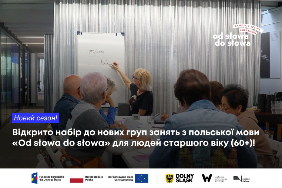 Шукаєте спосіб покращити знання польської мови та краще зрозуміти, як вона працює в повсякденному житті? Запрошуємо на новий цикл безкоштовних адаптаційно-мовних занять “Від слова до слова”, організований Вроцлавським Центром Соціального Розвитку. Ми зосередимося на повсякденному використанні мови – в магазині, у лікаря, в установах чи у розмовах із сусідами. Досвідчені викладачки також познайомлять учасників з польською культурою та звичаями. Навчання відбуватиметься у формі співпраці, ігор, розмов, вправ та роботи… Читати далі »Відкрито набір до нових груп занять з польської мови «Od słowa do słowa» для людей старшого віку (60+)!