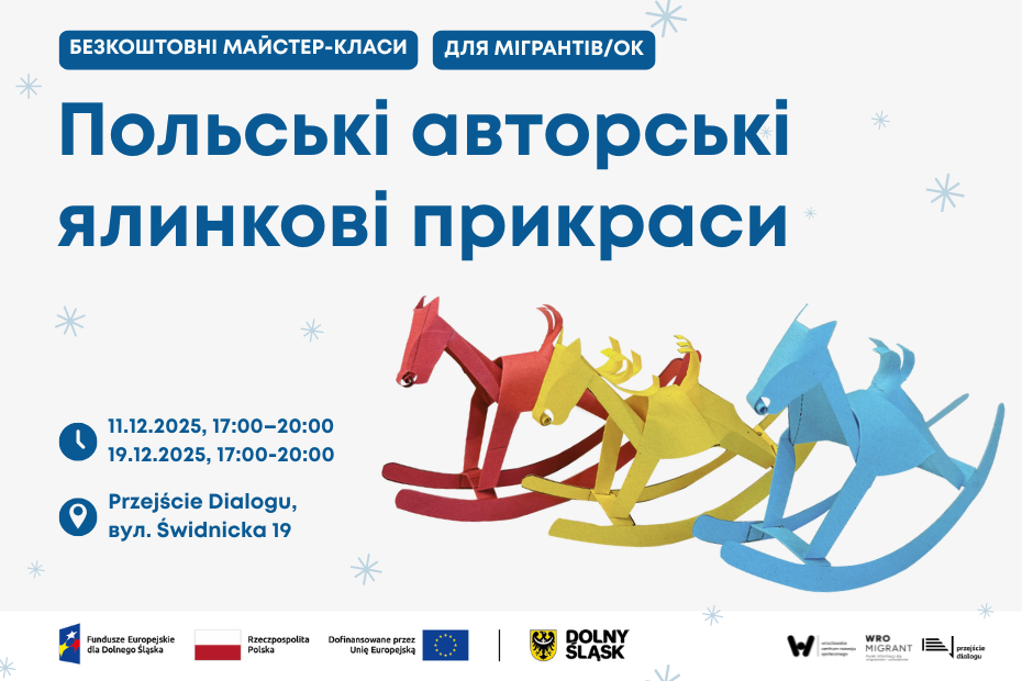 Запрошуємо на арт-терапевтичну сесію, де ми разом дослідимо, як наші психологічні проекції впливають на повсякденне життя. Увага! Заповнення форми не гарантує участі у заняттях. Необхідна реєстрація в проєкті «Від адаптації до інтеграції — підтримка громадян третіх країн у процесі міжкультурної інтеграції у Вроцлаві» (FEDŚ). Ознайомтесь з деталями тут. Пріоритетність участі визначається порядком заповнення паперової реєстраційної форми в Переході Діалогу. Ми зв’яжемося з Вами по телефону, щоб узгодити подальші кроки. Що… Читати далі »08.12 | Арт-терапія для жінок